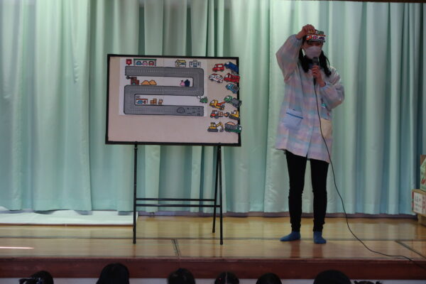 他のクラスのお友だちも始めは“〇〇ちゃんが出てきた~”と手を振ったり、“あれは何?” “次は何だ?”などと賑やかに観ていましたが、気がつくと台詞や歌を唄うさくらさんに釘付けになり、お話の世界に吸い込まれてるようでした。